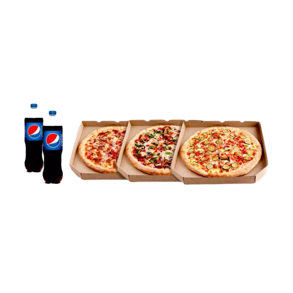 Пицца «Мясная» 30 см, пицца «Планета» 30 см, пицца «Чизбургер» 30 см, сода «Пепси» 2 л.
