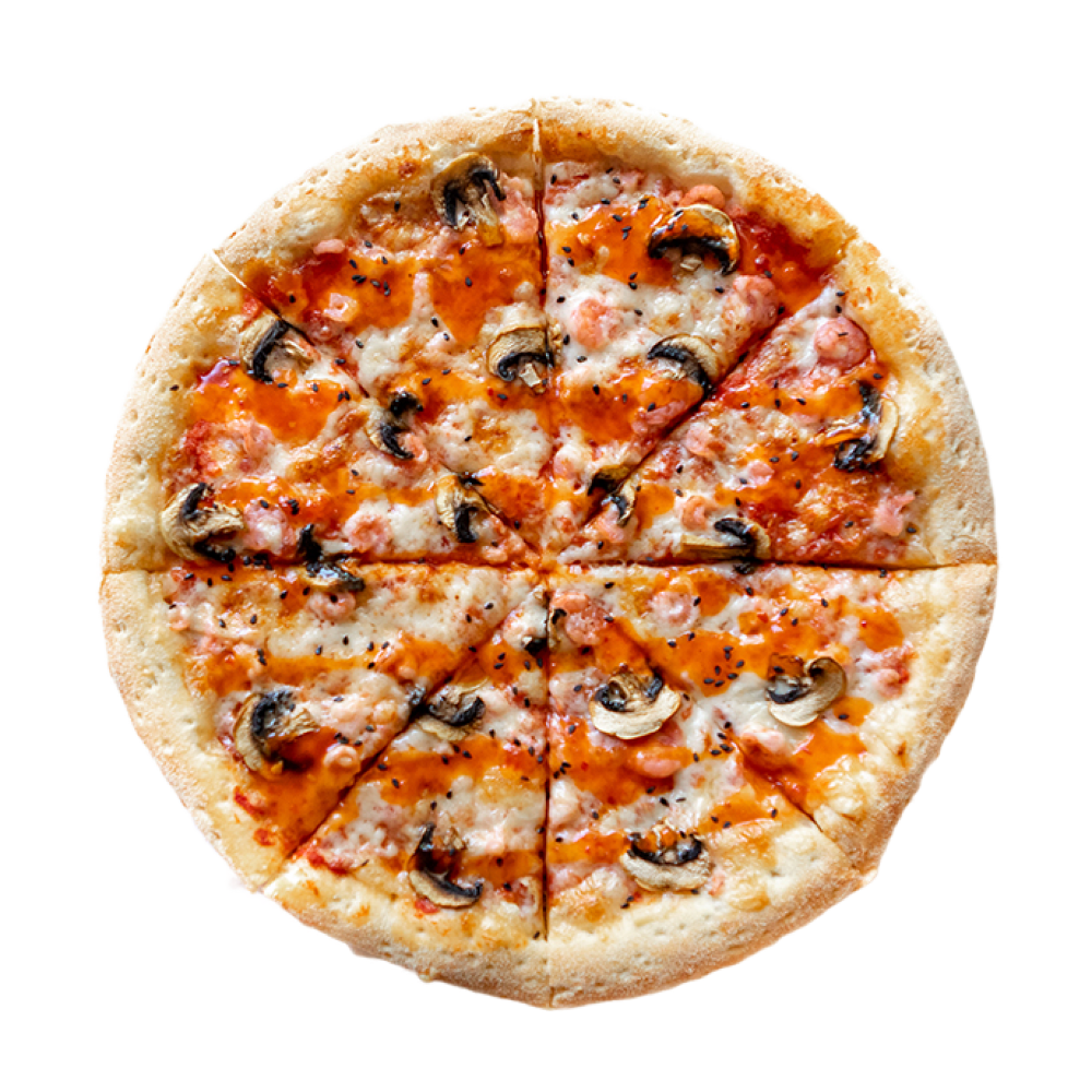 Томатный соус, сыр «Моцарелла», шампиньоны, креветки, сладко-кислый соус, черный кунжут
