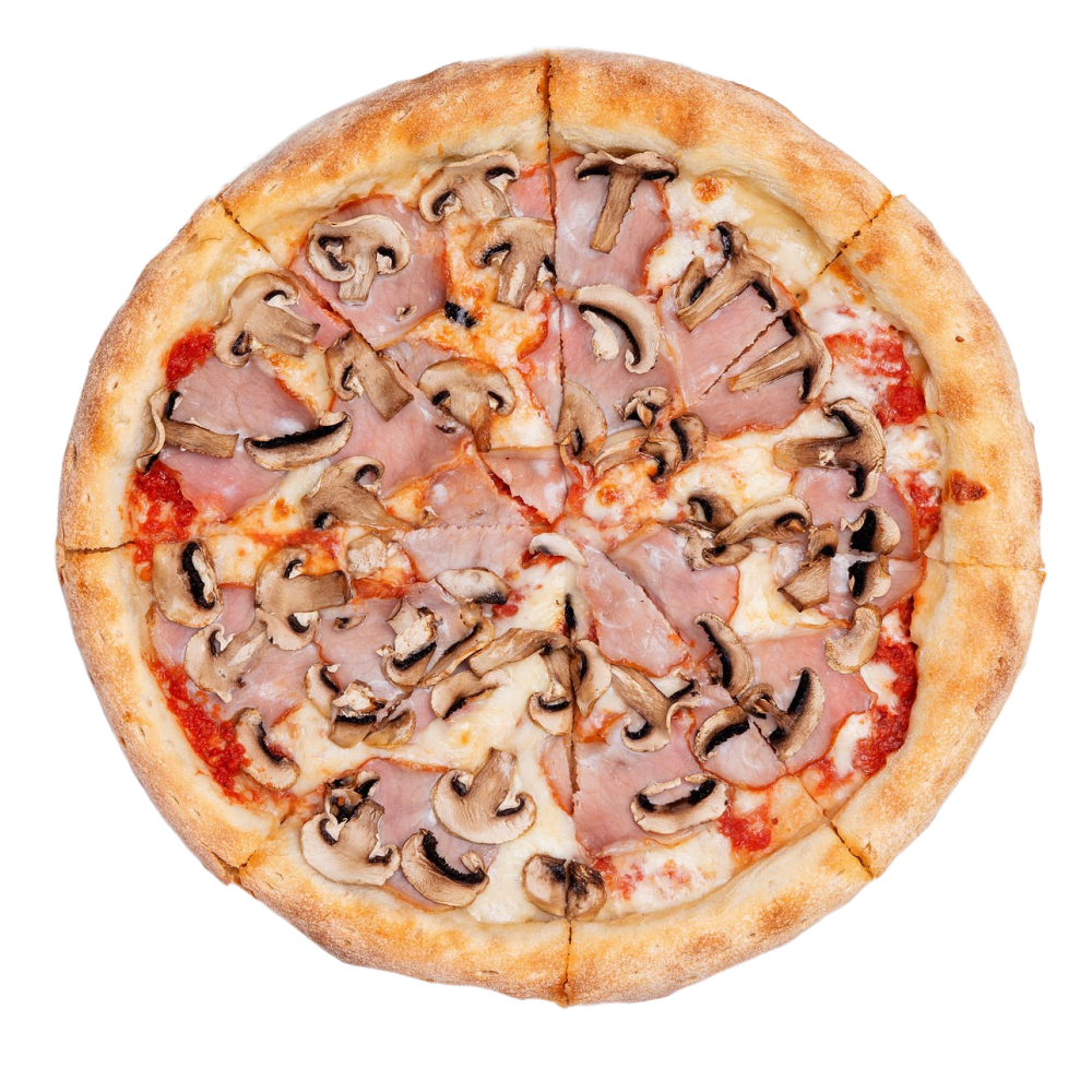Томатный соус, сыр «Моцарелла», ветчина, шампиньоны
