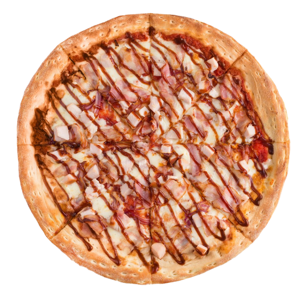 Томатный соус, сыр «Моцарелла», бекон, красный лук, куриное филе, соус «Барбекю»