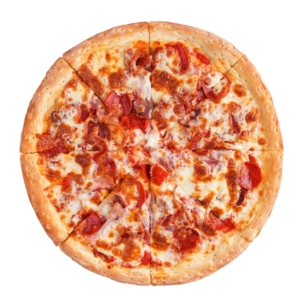 Салями, томатный соус, сыр «Моцарелла», бекон, ветчина, охотничьи колбаски